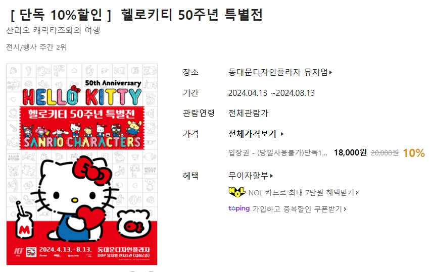헬로키티 50주년 특별전 티켓은 인터파크에서 단독 10% 할인된 금액으로 예매하실 수 있습니다.